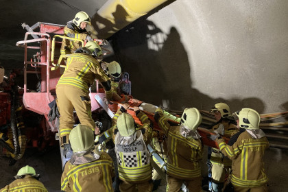 Außenstehende konnten den perfekt organisierten Ablauf der technischen Übung mitverfolgen: Alle Beteiligten wussten stets genau, was zu tun ist. Und die Einsatzkräfte gewannen an diesem Abend wertvolle Erkenntnisse, beispielsweise über die Funktion des Funksystems, die notwendige Registrierung der Einsatzkräfte, die sich in den Tunnel begeben, oder auch über Besonderheiten der eingesetzten Arbeitsmaschinen (Zugänglichkeit, Gewicht etc.).