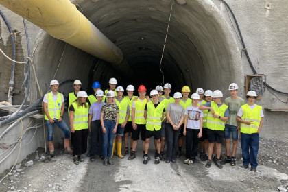 Die Schüler:innen des dritten Jahrgangs der Höheren Technischen Bundeslehr- und Versuchsanstalt (HTL) Rankweil mit Schwerpunkt Bautechnik waren am 5. Juli in Begleitung von zwei Lehrern zu Besuch auf der Baustelle des Erkundungsstollens Tisis. Nach einer Vorstellung des Entlastungsprojekts Stadttunnel Feldkirch ging's auf eine spannende Baustellenführung.