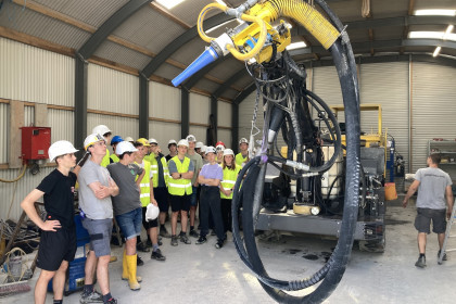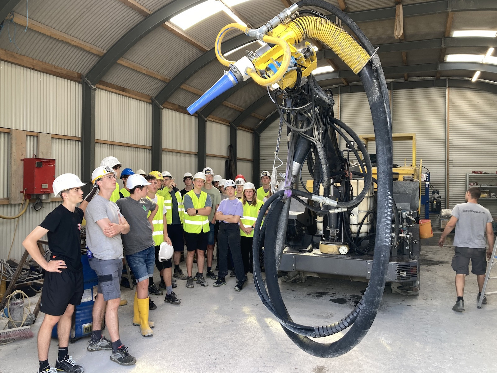 Die Jugendlichen bekamen Gelegenheit, die Vortriebsarbeiten im Stollen hautnah zu verfolgen: Sie konnten sogar eine Sprengung live miterleben. Bei der anschließenden Besichtigung der Werkstatthalle standen ihnen der Polier und Elektriker der ausführenden Firma Jäger Bau Rede und Antwort. Die beiden Fachmänner informierten unter anderem darüber, welche Geräte für den Vortrieb eingesetzt werden, sowie über die Elektroversorgung der gesamten Baustelle. Auch die Gewässerschutzanlage, die zur Aufbereitung und zur Reinigung des Tunnelabwassers benötigt wird, wurde genau erklärt.