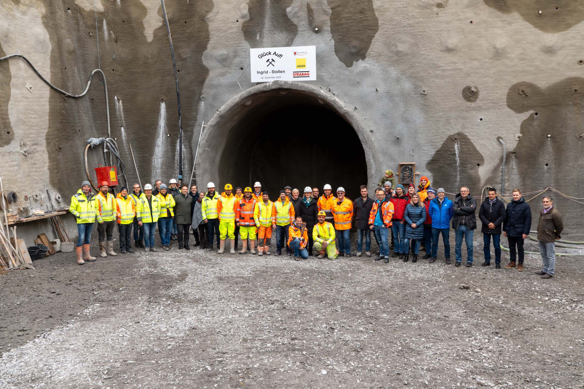 Rechtzeitig vor dem Feiertag aller Tunnelbauer und Bergleute, dem „Barbaratag“ am 4. Dezember, fand am vergangenen Freitag der traditionelle Tunnelanschlag des zweiten Erkundungsstollens für den Stadttunnel Feldkirch in Tisis statt. Der insgesamt rund 1.200 Meter lange Sondierstollen wird wertvolle Erkenntnisse für den Bau des Haupttunnels liefern und später zu einem Wartungs- und Fluchtstollen ausgebaut.