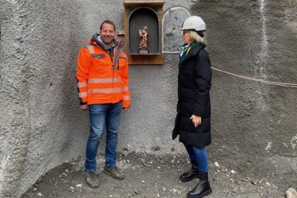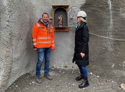 Namensgeberin für den „Ingrid-Stollen“ ist Ingrid Matt: Die Ehefrau des Feldkircher Bürgermeisters Wolfgang Matt hat das Ehrenamt der Tunnelpatin für den Erkundungsstollen übernommen. „Der Tunnelpatin kommt eine wichtige Aufgabe zu“, erläutert Projektleiter Bernhard Braza. „Sie ist während der Bauphase die irdische Vertreterin der Heiligen Barbara, der Schutzpatronin der Tunnelbauer und Mineure, und soll bei allen Tätigkeiten unter Tage Glück bringen und helfen, Unfälle zu vermeiden.“ Pfarrer Stefan Biondi aus Tisis segnete die Statue der Heiligen Barbara, die nach der Feier in einer kunstvoll verzierten Nische am Portal aufgestellt wurde.