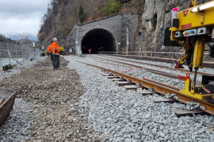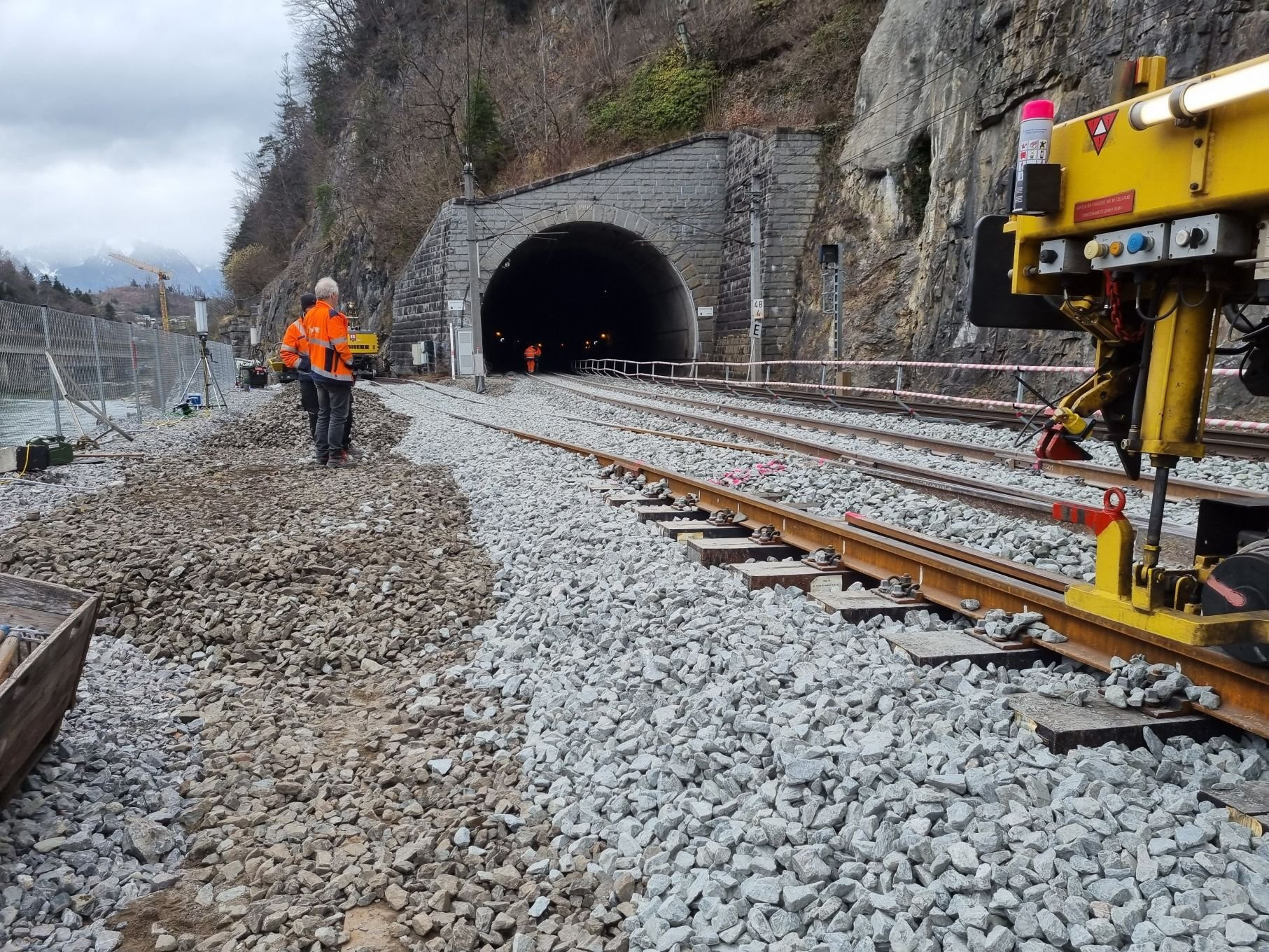 Die Bauleistungen für den Haupttunnel werden auch den Bau und Betrieb der Bahnverladeanlage für das Tunnelausbruchmaterial umfassen. Das anfallende Ausbruchmaterial – rund 950 Tonnen pro Tag – kann damit künftig per Bahn abtransportiert werden. Über ein eingehaustes Förderband gelangt das Ausbruchmaterial auf die andere Seite der Ill-Schlucht und wird dort auf der reaktivierten Westbahntrasse automatisch in Waggons entladen. Die Weiche für den Anschluss an das Hauptgleis wurde von den ÖBB bereits im April 2021 eingebaut.